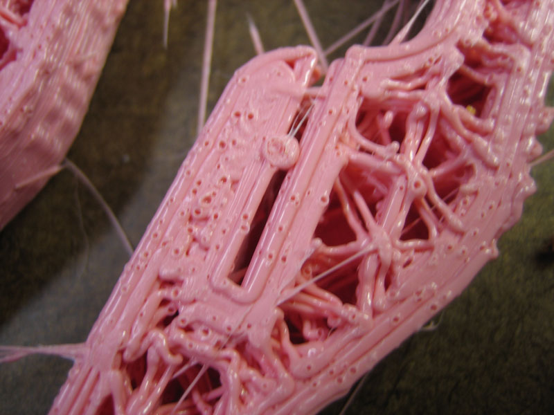 Here is another example of a print marred by expanding moisture bubbles. Remember to always store your filament in a moisture free environment. (My current prints are of much higher quality and twice this resolution btw :P )