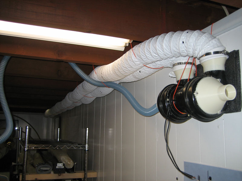 I bought 50′ [15.25m] of 3″ white marine duct hose online for $40. This was a nice inexpensive way to get the fumes out to my basement window. The hoses are attached to the blower adapters with pipe clamps.