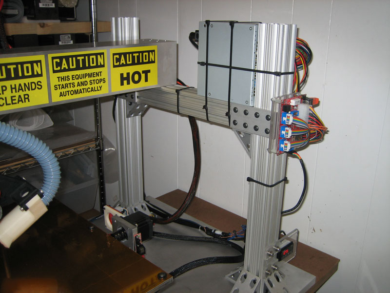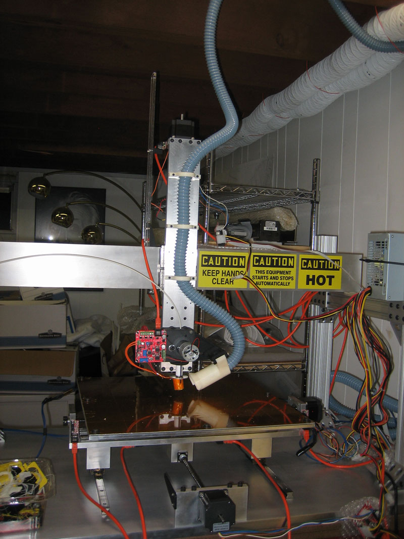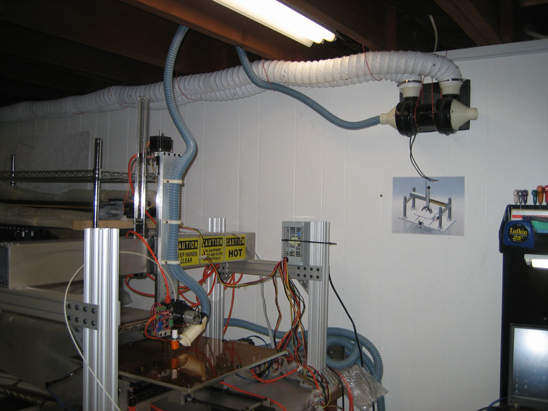 1″ blue “super” flexible duct hose was run to the extractor nozzle on the extruder. I even designed and printed 3 little parts to clamp the hose to the Z stage.